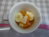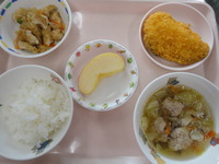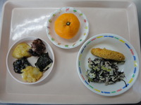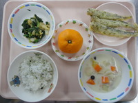 | フルーツポンチ | わかめごはん ししゃもの天ぷら ほうれん草と白菜の胡麻和え さつまいものシチュー みかん |