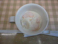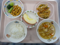 | バナナヨーグルト | ごはん ぎょうざのあんかけ 大豆煮豆 スティックきゅうり かきたま汁 りんご |