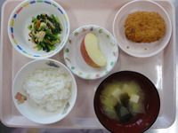 ごはん コロッケ 小松菜とじゃこの和え物 みそ汁 りんご |