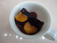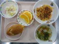 | グレープゼリー | うさぎパン ミートスパゲティ はくさいサラダ かぶとベーコンのスープ オレンジ |