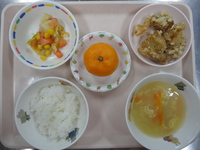 ごはん 鶏肉のから揚げ キャベツとコーンの中華和え コーン卵スープ みかん |