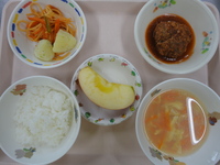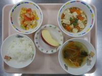 ごはん マーボー豆腐 きゃべつとコーンの中華和え わかめスープ りんご |