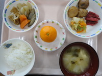報恩講料理 ごはん 煮物 里芋のころ煮 白菜のごま和え すこ みそ汁 みかん |