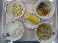 ごはん さばの煮つけ さつまいもサラダ ビーフンスープ バナナ |