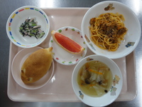 | りんごゼリー | うさぎパン ミートスパゲティ ひじきと小松菜のごまマヨ和え キャベツのベーコンスープ グレープフルーツ |