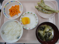 わかめごはん ししゃもの天ぷら にんじんの和風サラダ みそ汁(えのき) バナナ |