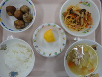 ごはん さといものころ煮 きのこのスパゲティソテー 野菜ころころスープ 柿 |