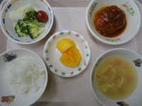 ごはん 豆腐ハンバーグソース煮 ミニトマト 粉ふき芋 ゆでブロッコリー コーン卵スープ りんご |