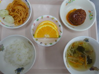 ごはん ハンバーグソース煮 粉ふき芋 スパゲティソテー わかめスープ オレンジ |