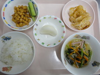 ごはん ぎょうざのあんかけ 大豆煮 スティックきゅうり 中華風スープ なし |