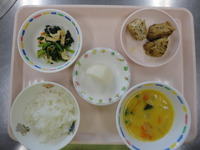 ごはん がんもどきの煮つけ 小松菜とじゃこの和え物 かぼちゃのシチュー 梨 |