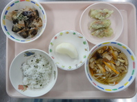 ごはん ちくわの磯辺揚げ 秋なすの甘辛炒め 煮込みうどん 梨 |