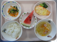 ごはん 鮭のマヨチーズ焼き 三色ナムル 野菜スープ スティックきゅうり すいか |