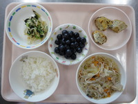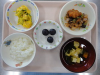 ごはん 鶏肉のけちゃっぷ煮 かぼちゃと卵のサラダ 冷たいすまし汁 巨峰 |