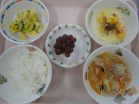 ごはん ポテトとコーンの重ね煮 かぼちゃと卵のサラダ 肉団子スープ ブドウ |