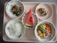 ごはん がんもどきの煮つけ なすの甘辛炒め 五目そうめん すいか |