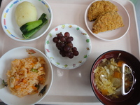 チキンライス ミンチカツ ハムサラダ かきたま汁 ぶどう |