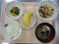 ごはん 牛肉とじゃが芋の煮物 青菜とコーンのごま和え みそ汁 バナナ |