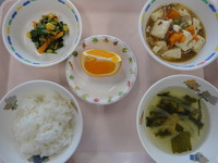| 昆布おにぎり | ごはん マーボー豆腐 青案とコーンのごま和え わかめスープ オレンジ |