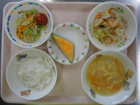 ごはん 焼きビーフン キャベツのゆかり和え ミニトマト コーン卵スープ メロン |