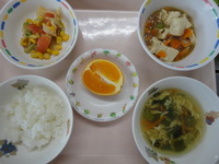 ごはん マーボー豆腐 キャベツとコーンの中華和え おくらスープ オレンジ |