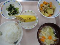 | りんごゼリー | ごはん 肉じゃが ほうれん草ともやしのお浸し みそ汁 バナナ |