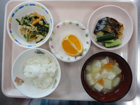 ごはん 焼きさば 五目和え スティックきゅうり みそ汁 オレンジ |