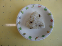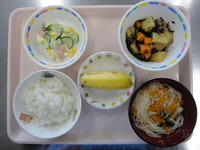 | 昆布おにぎり | ごはん じゃがいものひじき煮 ハムサラダ そうめん汁 バナナ |