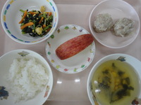 ごはん 手作りしゅうまい 小松菜と卵の炒め物 わかめスープ りんご |