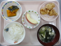 ごはん 鶏のから揚げ かぼちゃ煮 ミニトマト えのきのみそ汁 りんご |