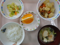 ごはん 筑前煮 ごま酢きゃべつ 勝山水菜のみそ汁 みかん |