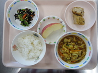 わかめごはん がんもどきの煮つけ 納豆のそぼろ和え 和風カレーうどん りんご |