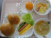 | 鮭おにぎり | バターロール セルフサンド ポテトとコーンの重ね煮 野菜スープ オレンジ |