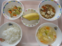 ごはん マーボー豆腐 キャベツのゆかり和え 春雨スープ バナナ |