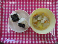 | そぼろおにぎり 具だくさん味噌汁 |
