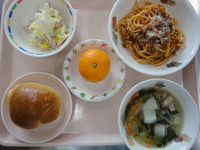 ロールパン ミートスパゲティ 白菜のサラダ かぶとベーコンのスープ みかん |
