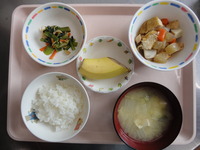 ごはん 厚揚げと野菜のとろみ煮 小松菜とじゃこの炒め物 みそ汁 バナナ |
