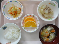 ごはん そぼろ大根 白菜のおかか和え さつまいもとえのきの味噌汁 オレンジ |