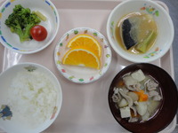 | りんごゼリー | 鯖の味噌煮 ブロッコリーのごま和え 豚汁 ご飯 オレンジ |