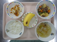 牛肉とじゃが芋の煮物 柿と大根のサラダ キャベツのベーコンスープ ごはん バナナ |
