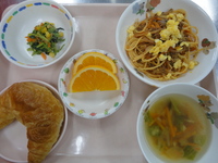 ナポリタン 青菜とコーンのゴマ和え わかめスープ クロワッサン オレンジ |
