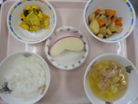 大豆の五目煮 かぼちゃと卵のサラダ 玉ねぎとベーコンのスープ ご飯 柿 |