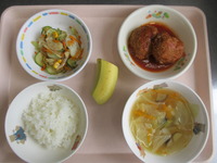 ハンバ-グソ-ス煮 キャベツのおかか和え コンソメスープ ごはん バナナ |