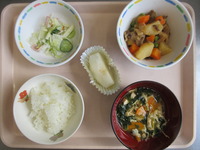 牛肉とじゃが芋の煮物 ハムサラダ かき玉汁 ごはん 梨 |