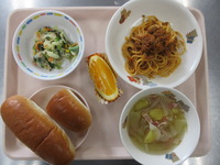 ミ-トスパゲティ 小松菜サラダ 玉ねぎとベ-コンのスープ 超熟ロ-ル |