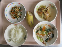 ハニ-スパイシ-チキン にんじんのじゃこごま和え ワンタンス-プ(豚肉) ごはん バナナ |