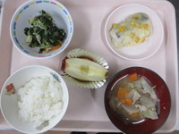 白身魚のクリ-ムコ-ン焼き キャベツとほうれん草の磯和え 豚汁 ごはん りんご |