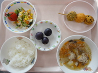 | おにぎり | 串団子 小松菜のサラダ 肉団子スープ ご飯 ミニトマト 巨峰 |