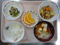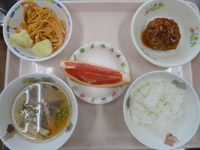 | オレンジゼリー | ハンバーグソース煮 スパゲティソテー 粉ふき芋 わかめスープ ご飯 グレープフルーツ |