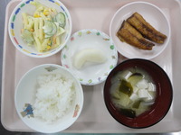 さんまのかば焼き マカロニサラダ わかめと豆腐のみそ汁 ご飯 梨 |